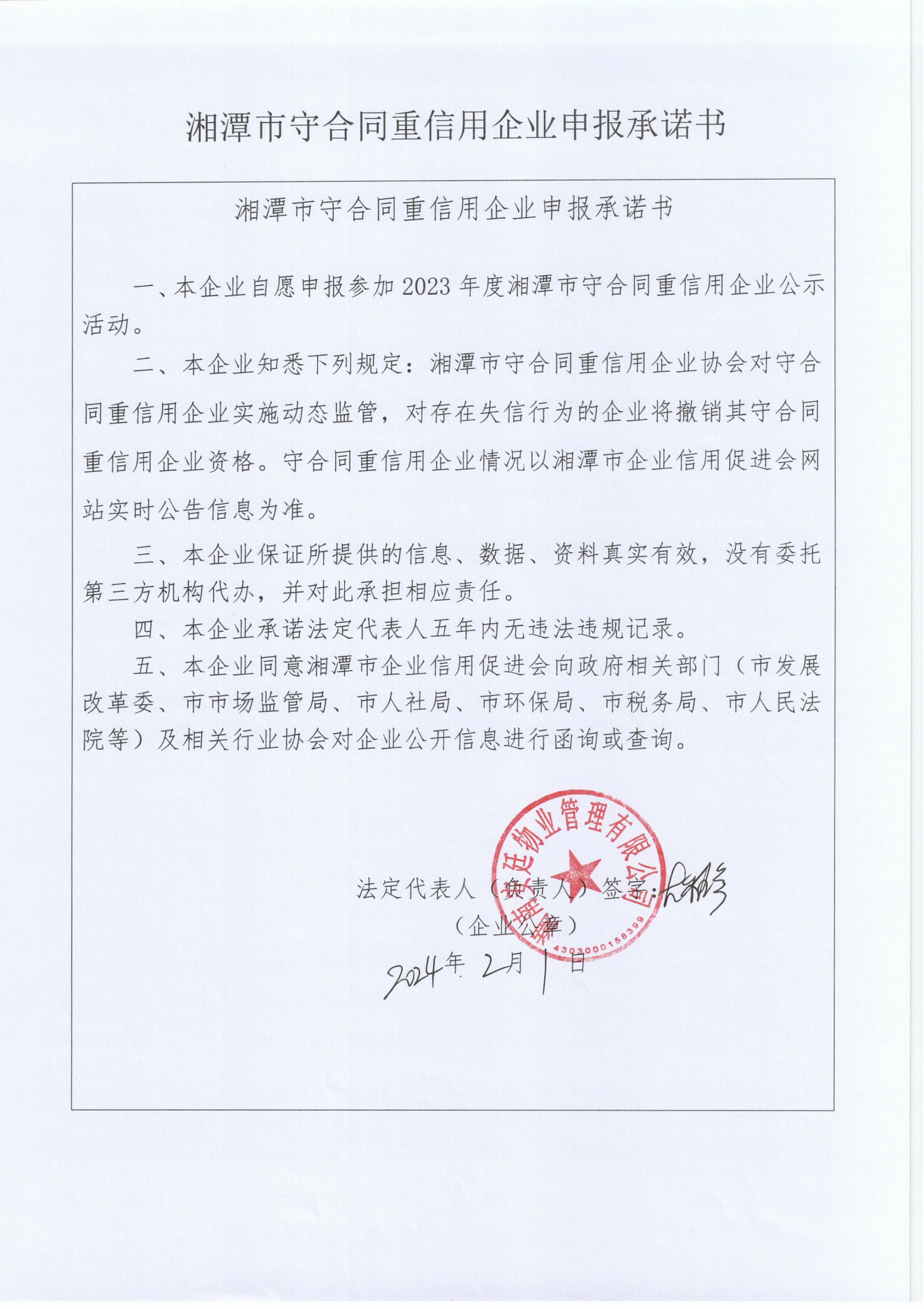 本企業(yè)根據(jù)《湘潭市守合同重信用企業(yè)申報(bào)規(guī)定》等編制 2023 年度企業(yè)信用報(bào)告書(shū),并保證本報(bào)告書(shū)內(nèi)容真實(shí)、準(zhǔn)確、完整。